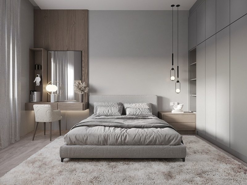 Bedroom – Jl Pasar III A restful sanctuary where simplicity and warmth define the experience. Soft grey tones, natural wood textures, and carefully placed lighting establish a calm, uncluttered environment. Every detail is designed to encourage relaxation and renewal, offering the resident a private retreat that feels modern, soothing, and deeply personal.