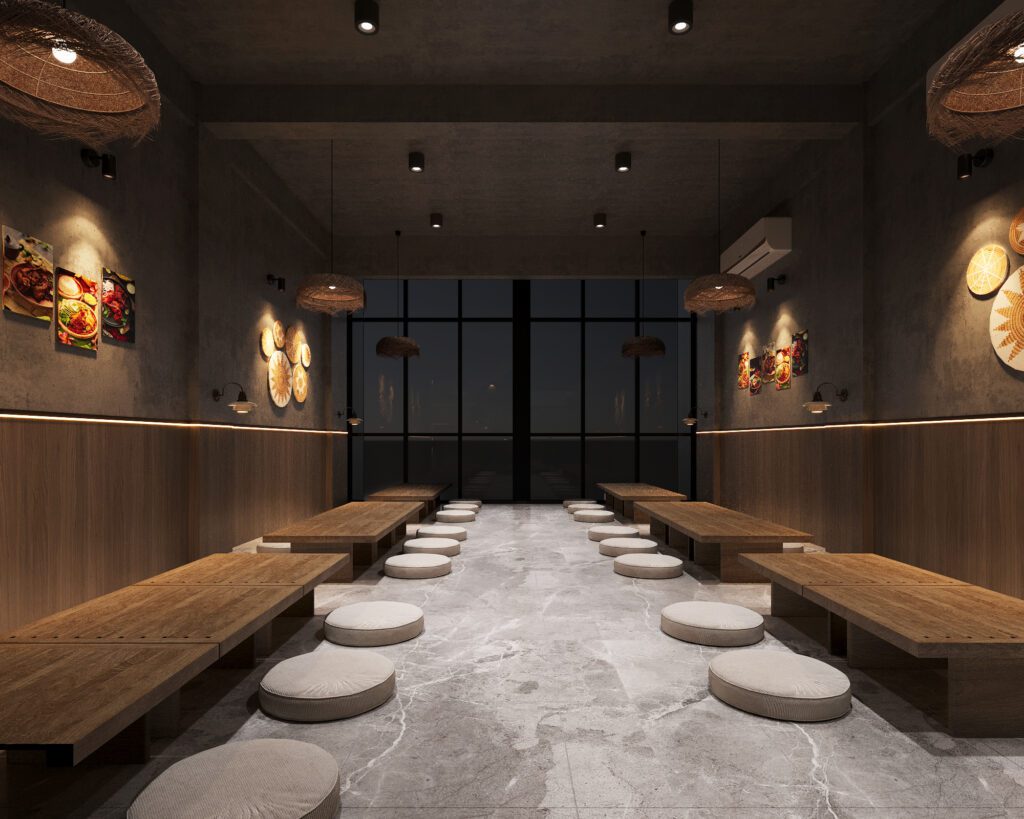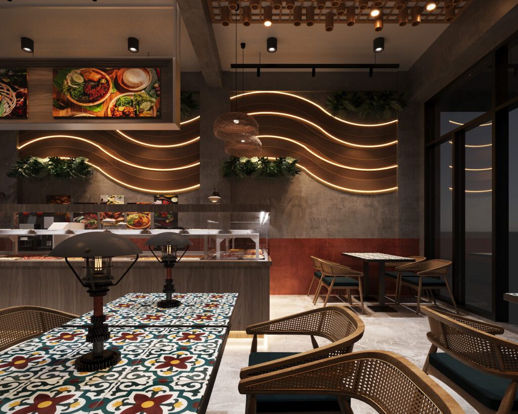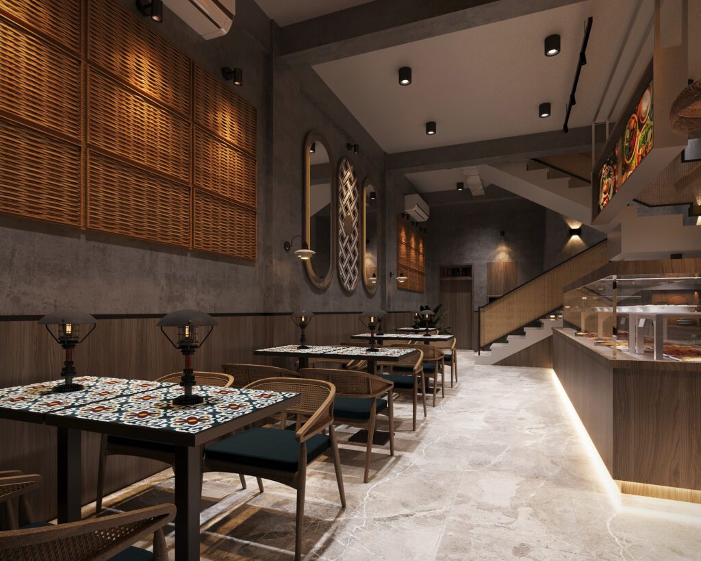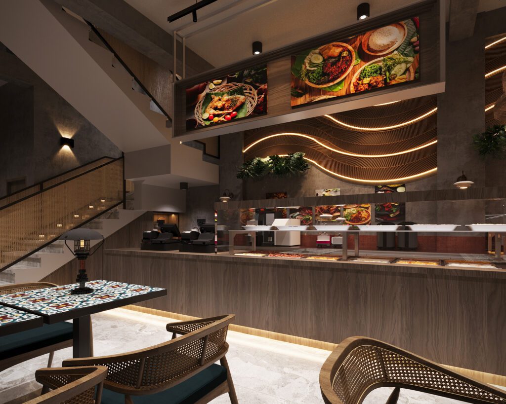 A refined dining space defined by earthy tones, textured finishes, and soft lighting. Communal seating reflects togetherness, while the natural palette creates a grounded, welcoming atmosphere. The design emphasizes authenticity and trust, enhancing the brand’s flavors with a premium and approachable environment.