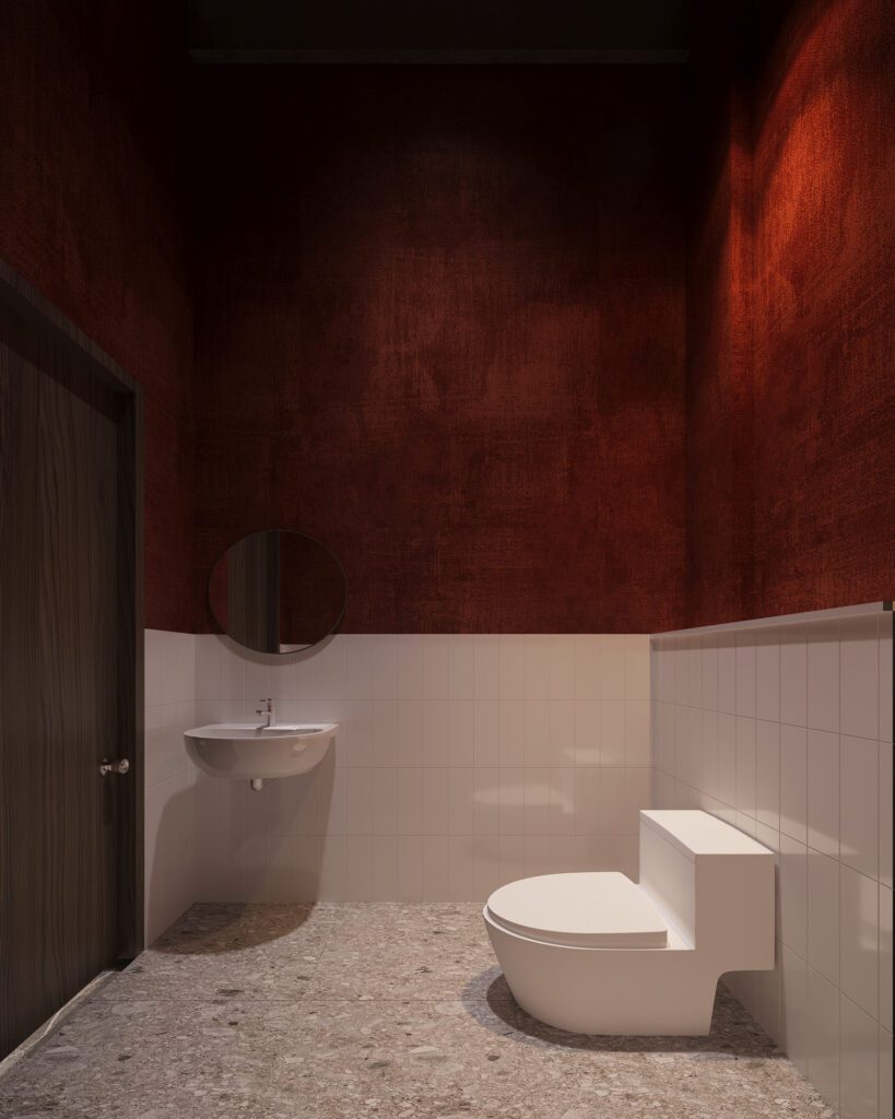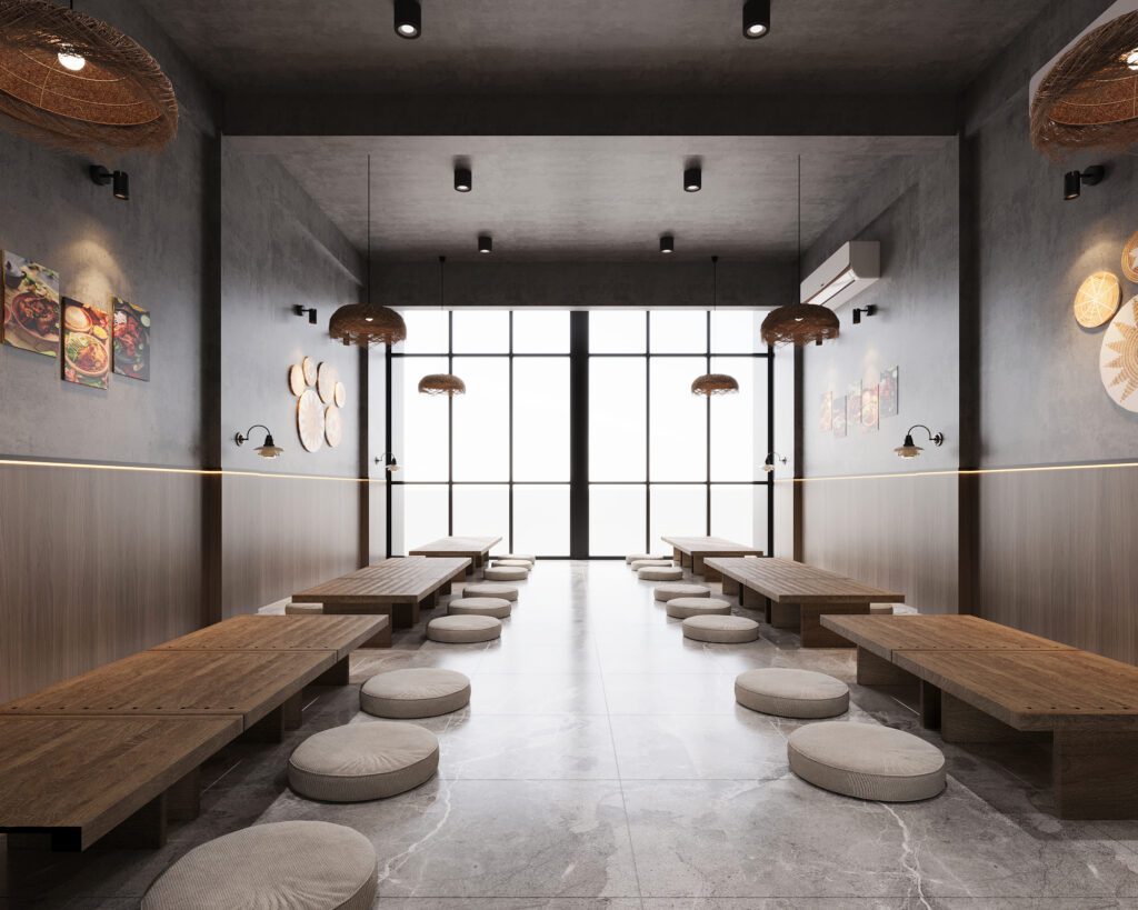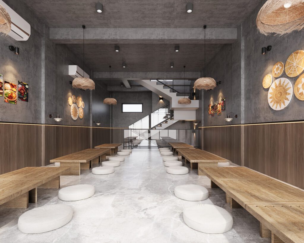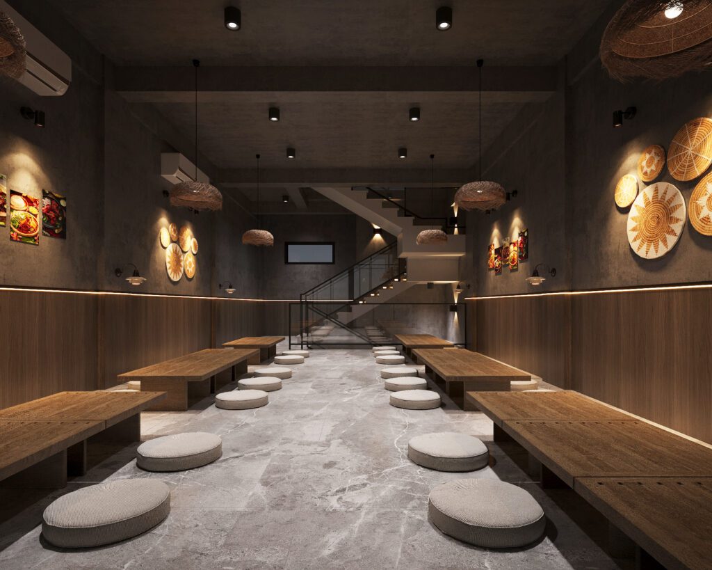 A refined dining space defined by earthy tones, textured finishes, and soft lighting. Communal seating reflects togetherness, while the natural palette creates a grounded, welcoming atmosphere. The design emphasizes authenticity and trust, enhancing the brand’s flavors with a premium and approachable environment.