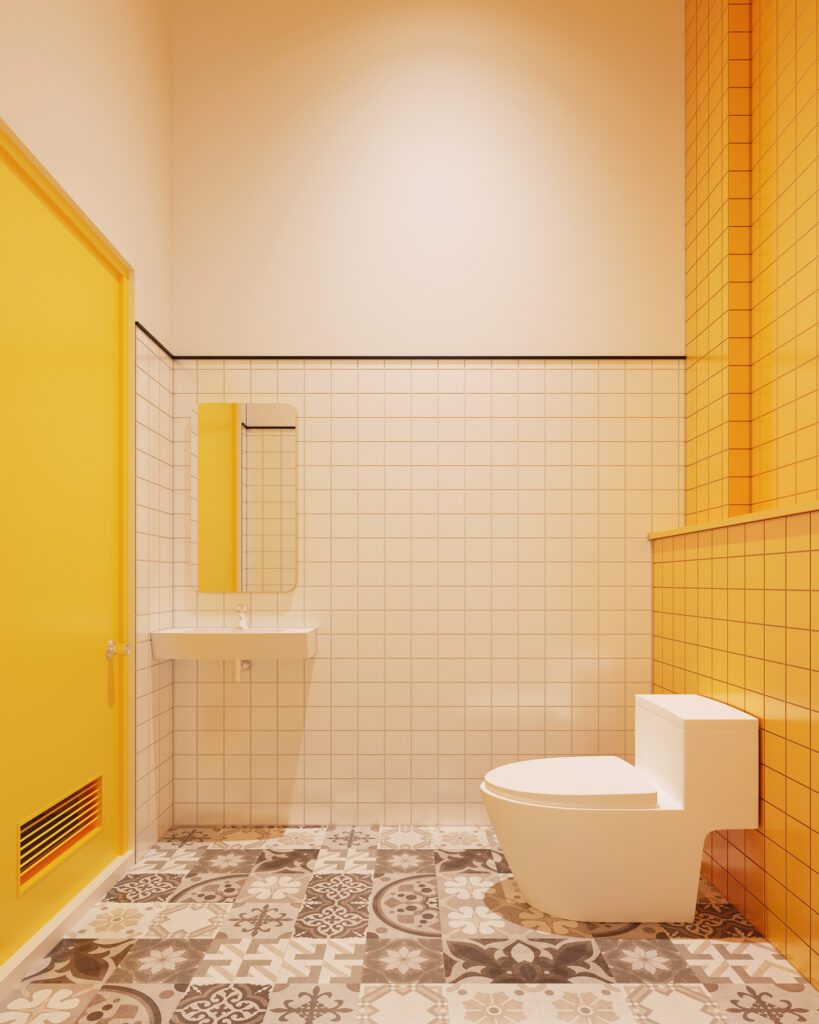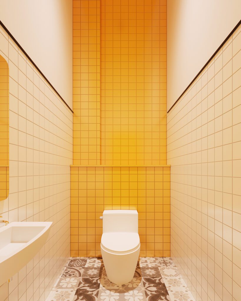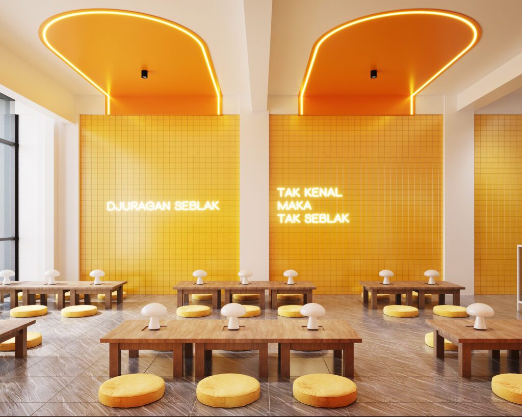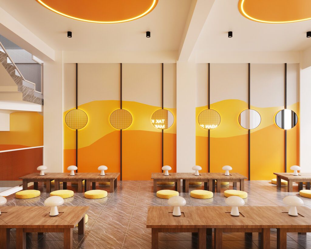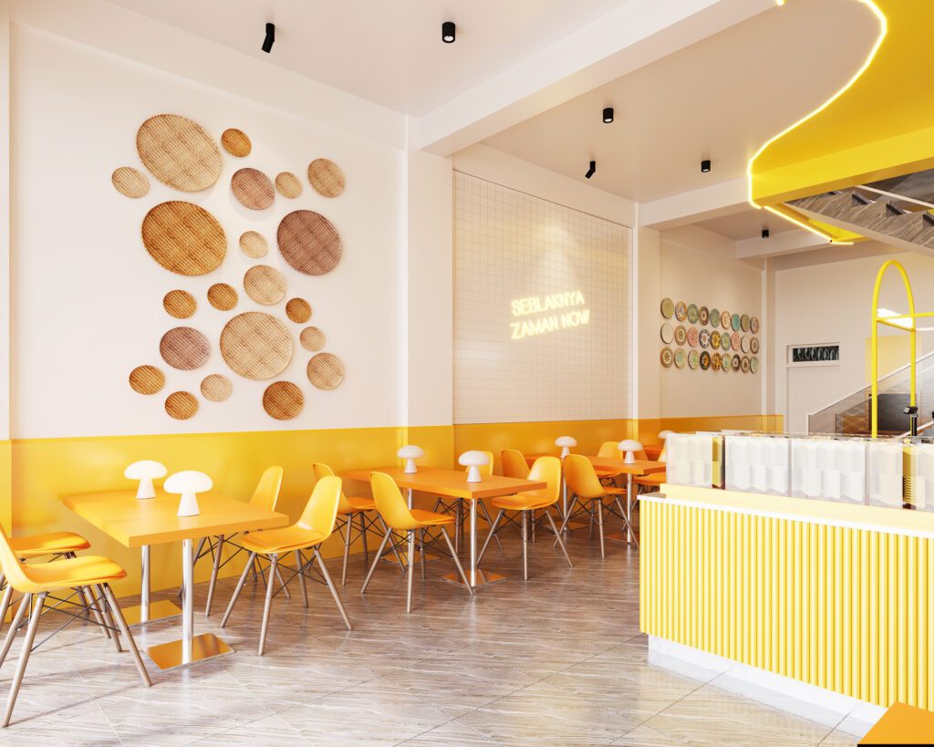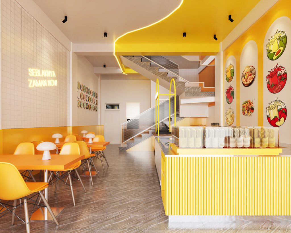 A playful and cohesive dining destination where bold yellow tones, white tiles, and patterned flooring bring the brand to life. Curved ceilings with integrated lighting add movement and energy, while seating layouts are designed for both groups and casual diners. Even the restrooms carry the same design language, ensuring a seamless and memorable customer experience throughout.
