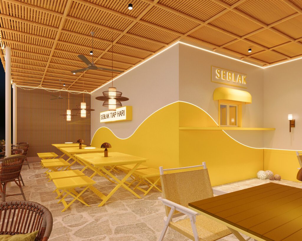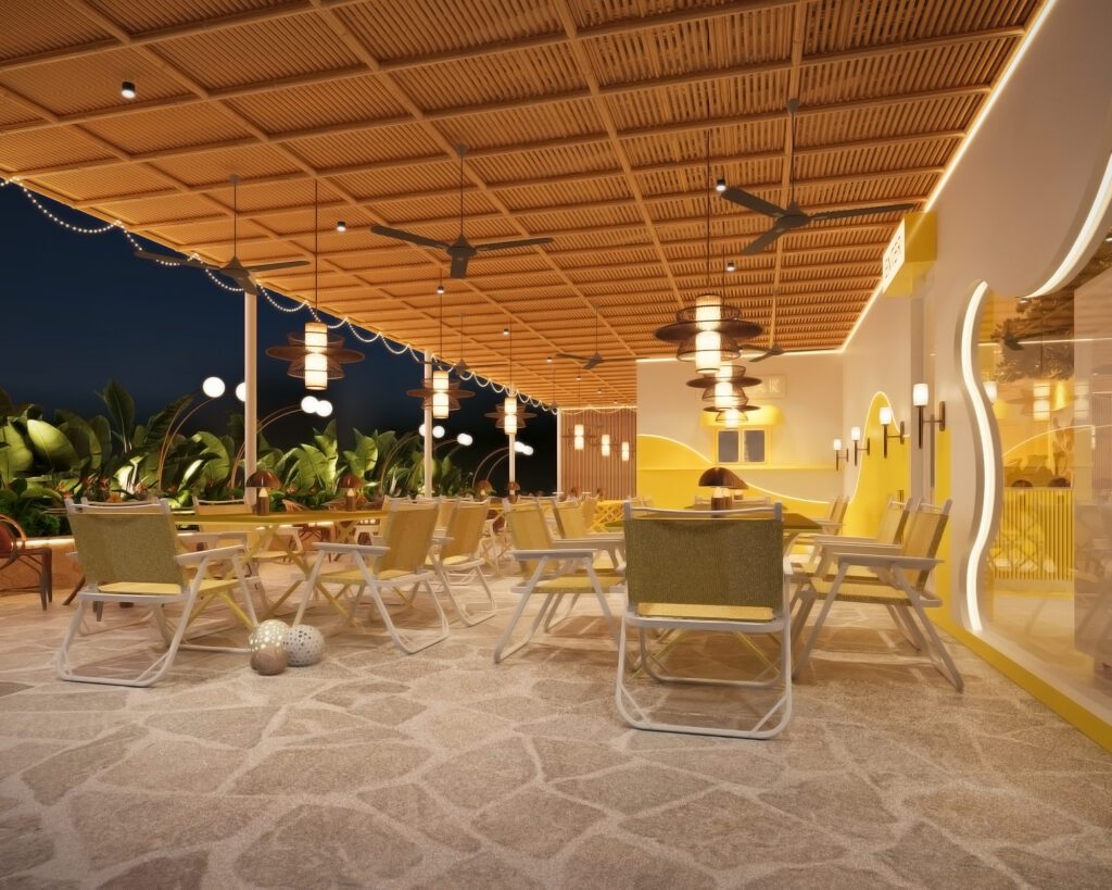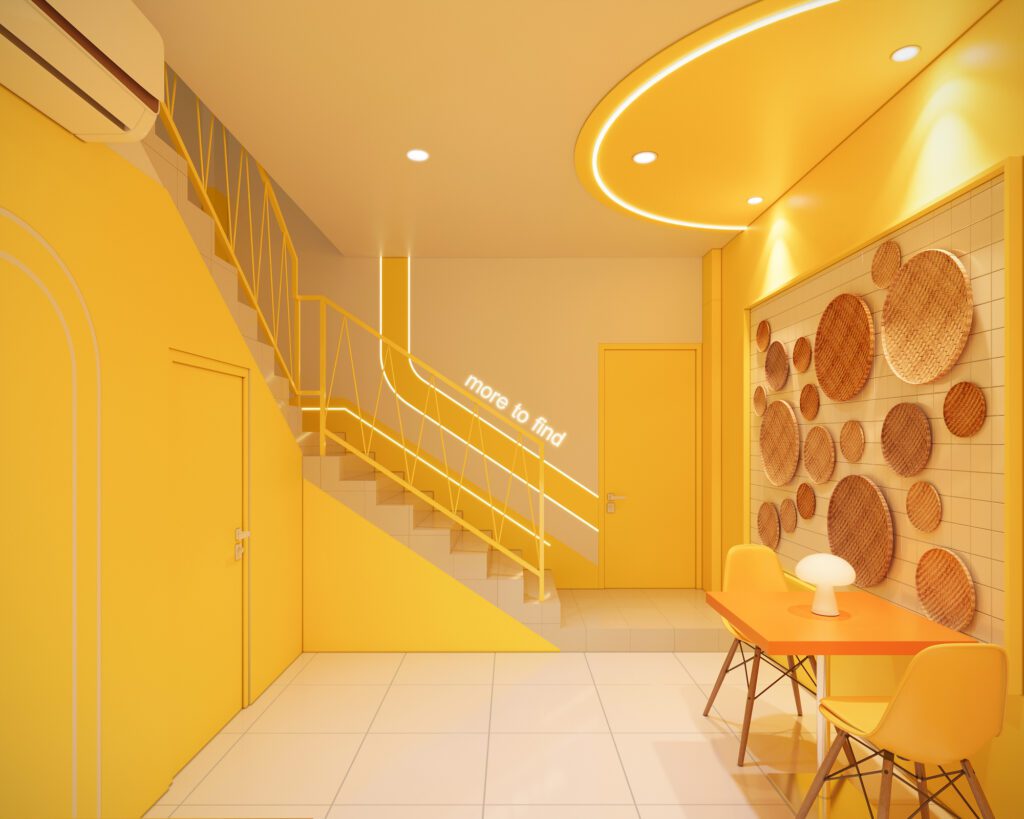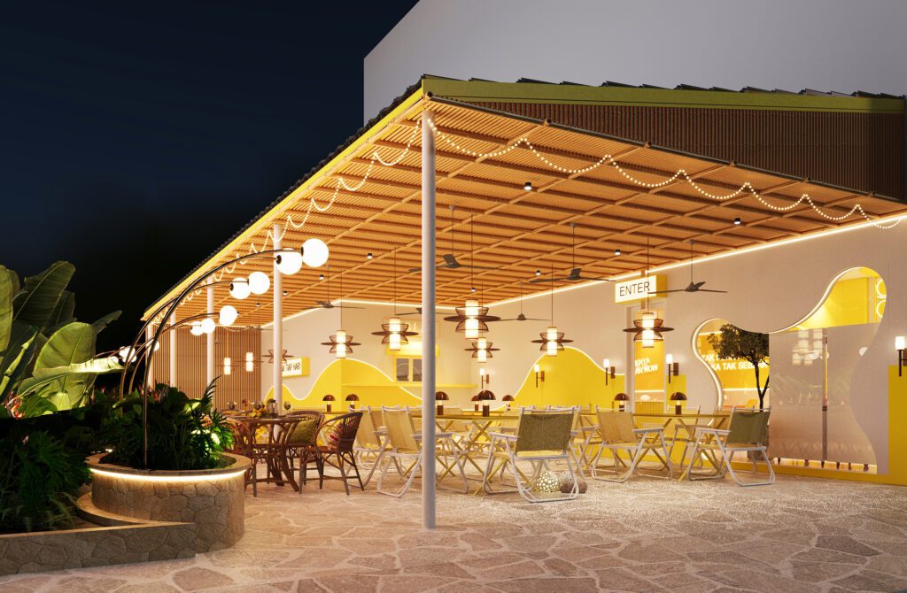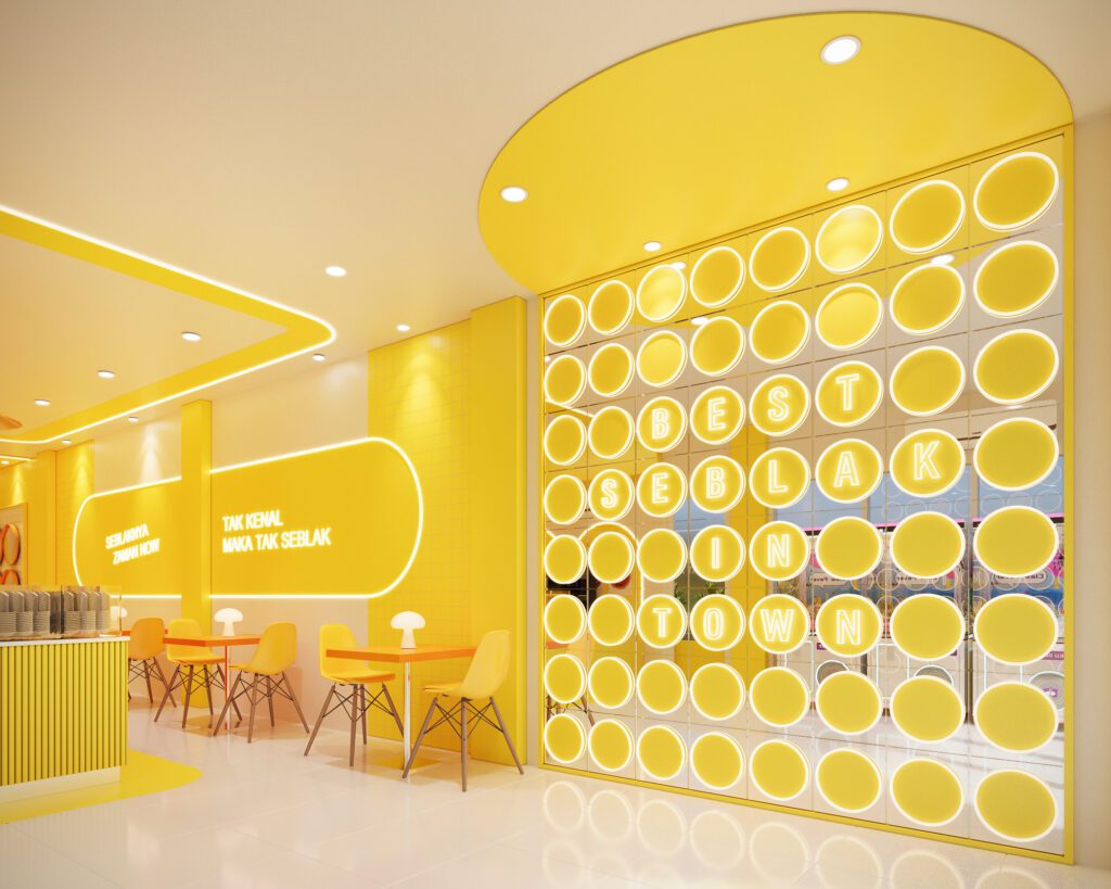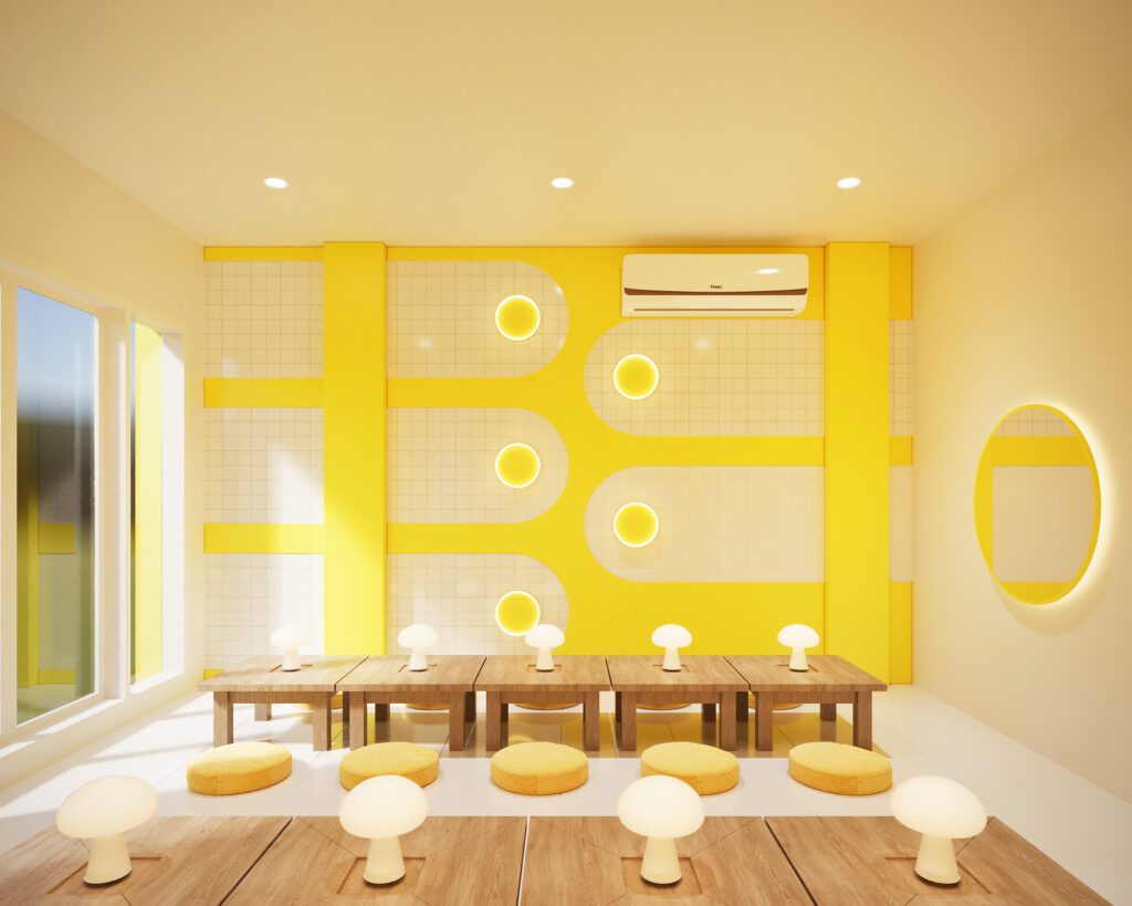 This outlet blends a youthful aesthetic with a welcoming atmosphere. Bright yellows, rounded wall accents, and natural outdoor seating create a space that feels both fresh and fun. Designed for casual gatherings and family meals alike, it ensures customers enjoy not just the food but the full dining experience.