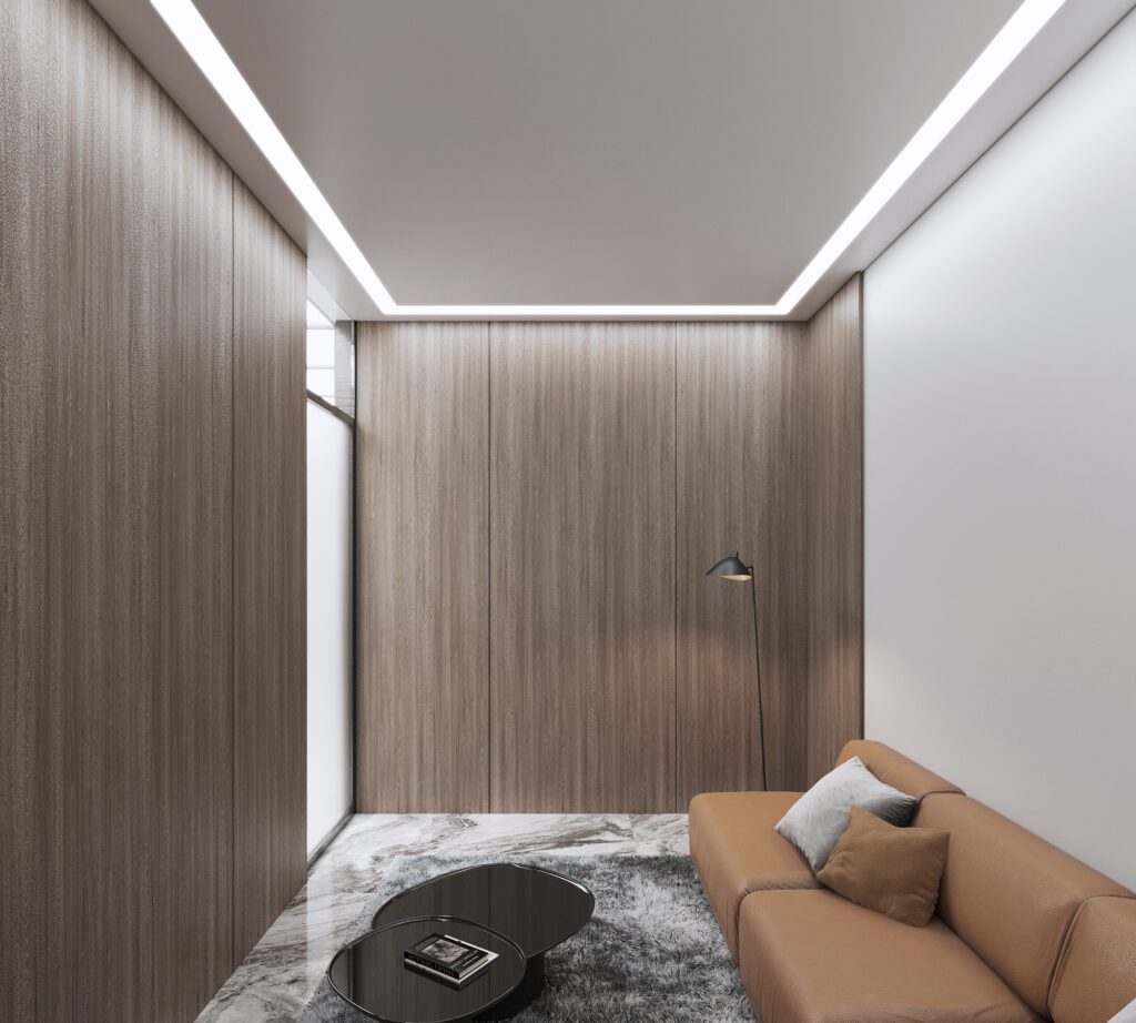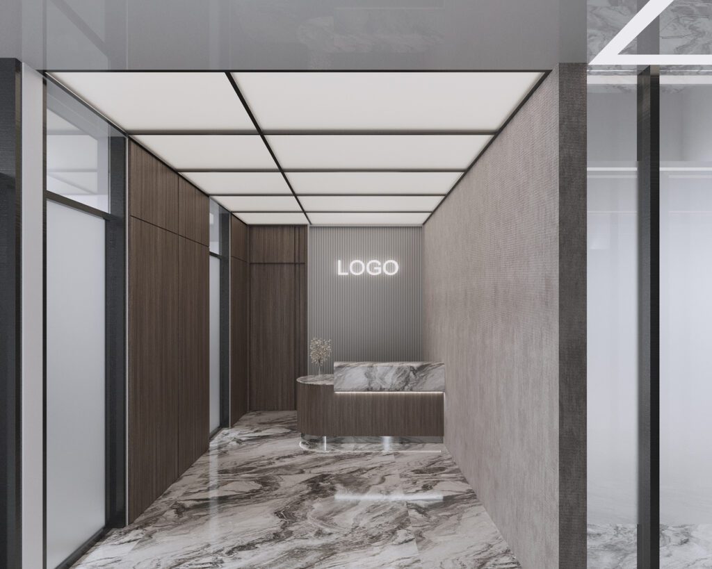 The objective was to create a modern, high-impact entrance that projects corporate stability and excellence. Clean lines and premium materials — including a striking marble floor and high-gloss wood paneling — form the foundation. Subtle recessed lighting and a floating ceiling design introduce sophistication and openness, resulting in a reception area that communicates quality from the very first impression.