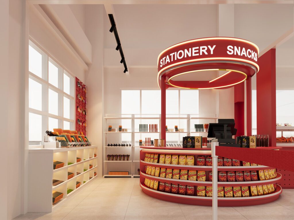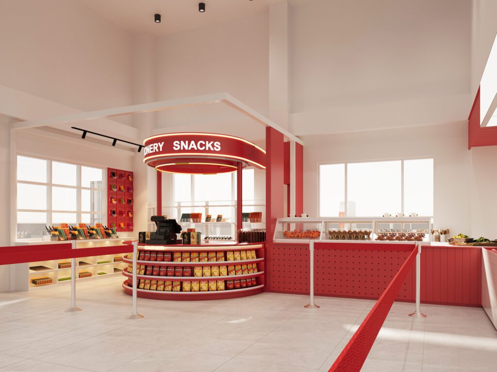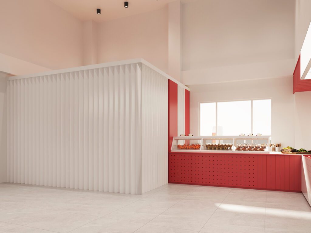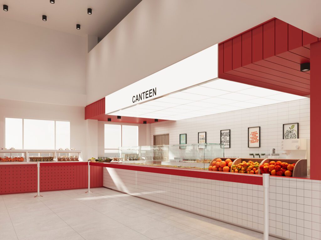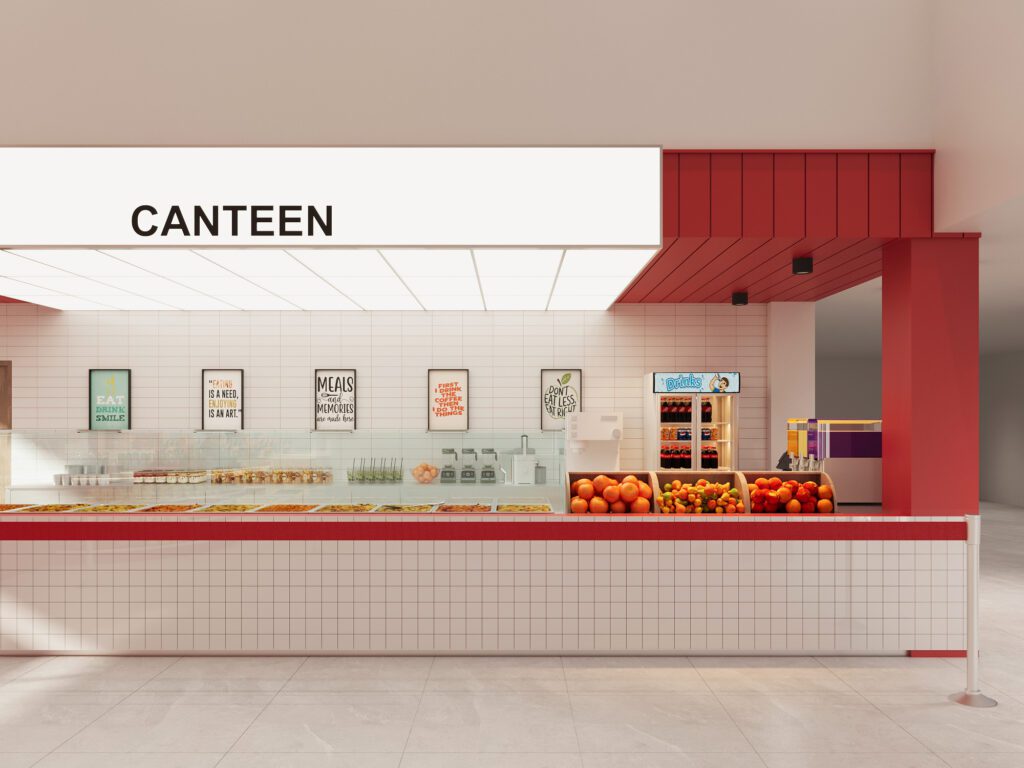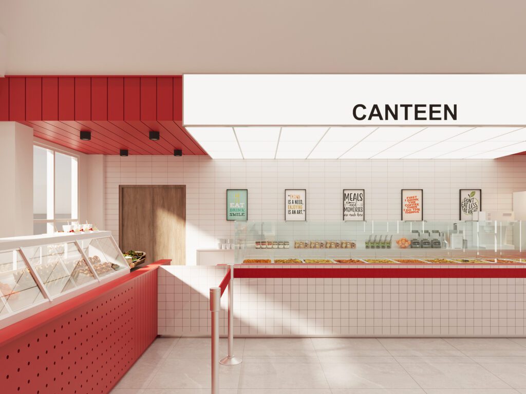 A school canteen reimagined as a modern social hub. Bold red accents inject energy and playfulness, while clean white tiles and structured layouts ensure order and easy maintenance. Functional during busy hours yet welcoming at all times, the space encourages students to gather, dine, and connect in a lively, contemporary setting.