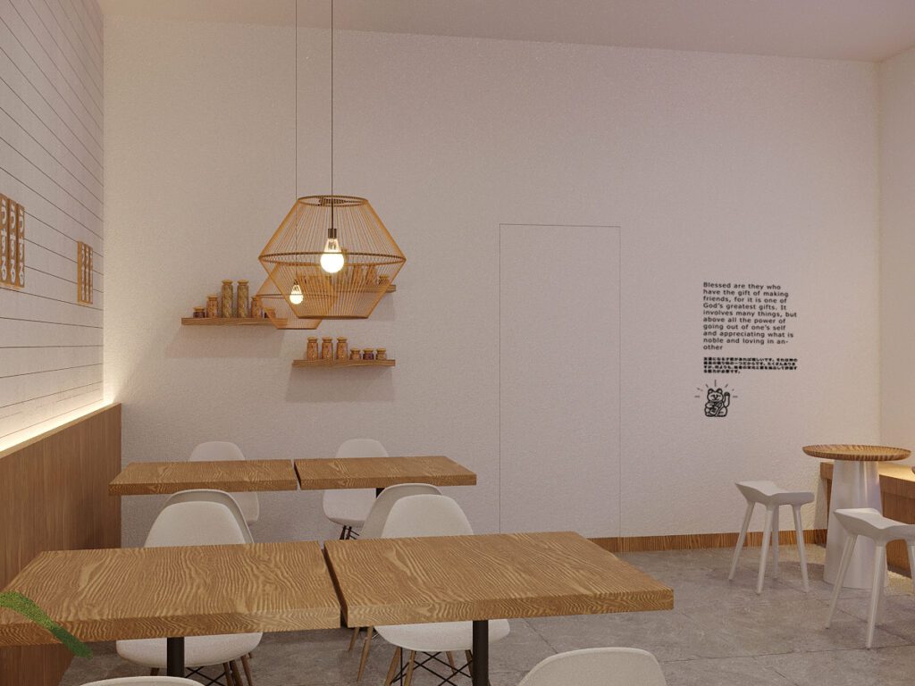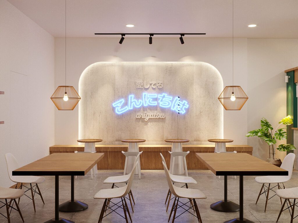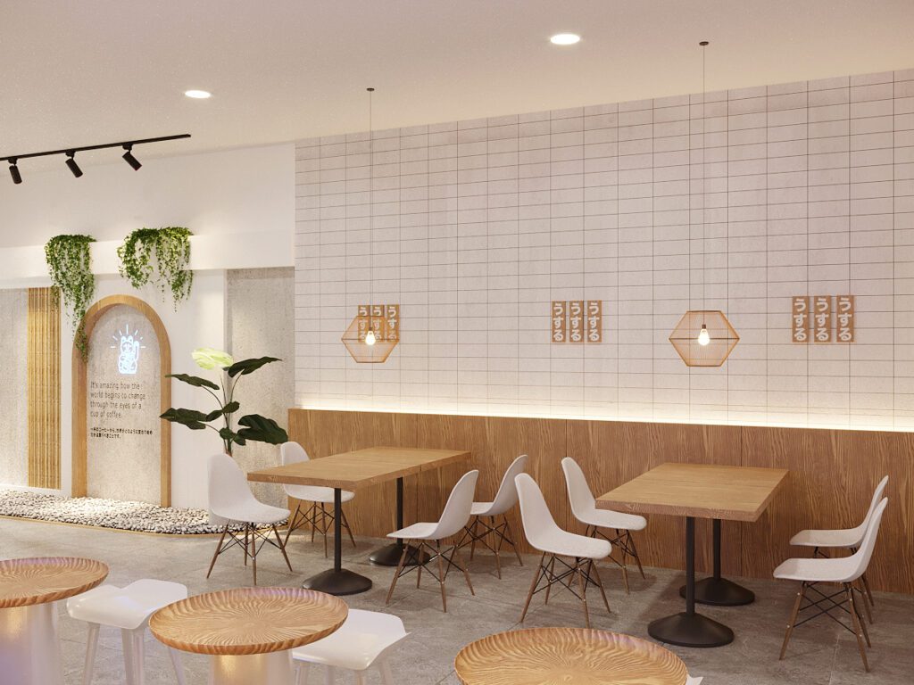 A minimalist and cozy cafe that reflects Japanese simplicity. White brick walls, light wood tones, and natural greenery create a bright, welcoming space. Warm lighting and simple furnishings encourage customers to linger, making the cafe an inviting retreat for both work and relaxation.