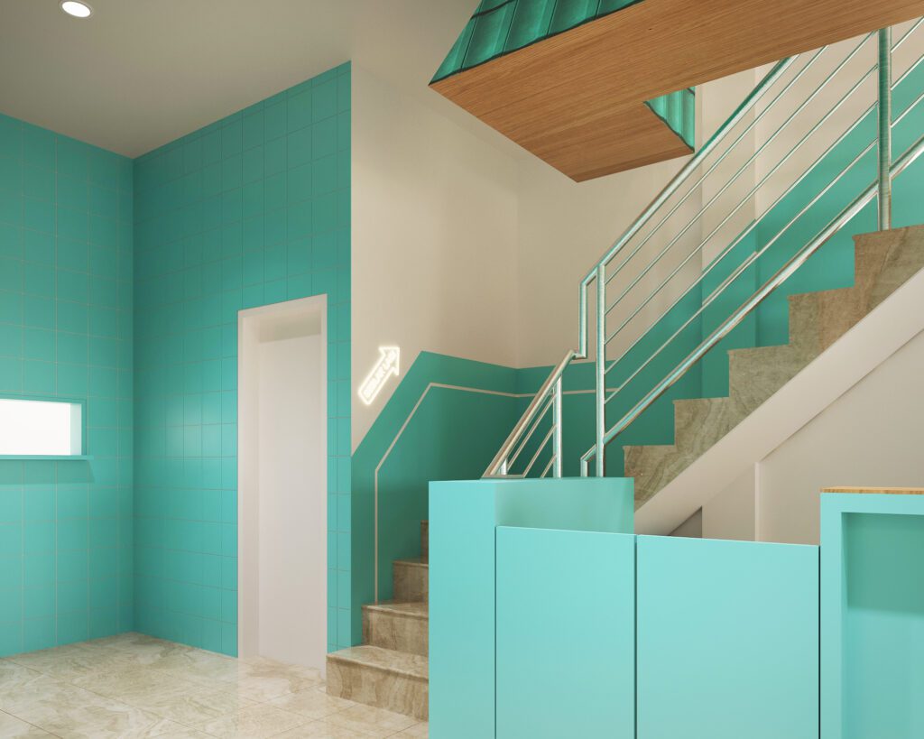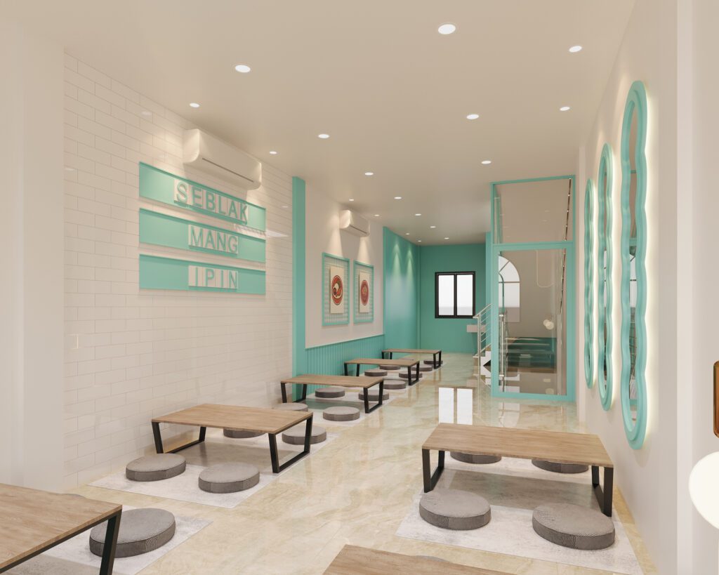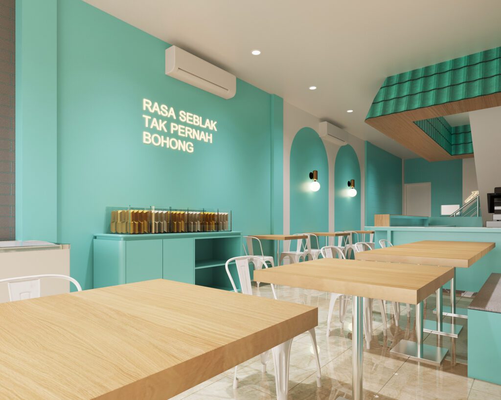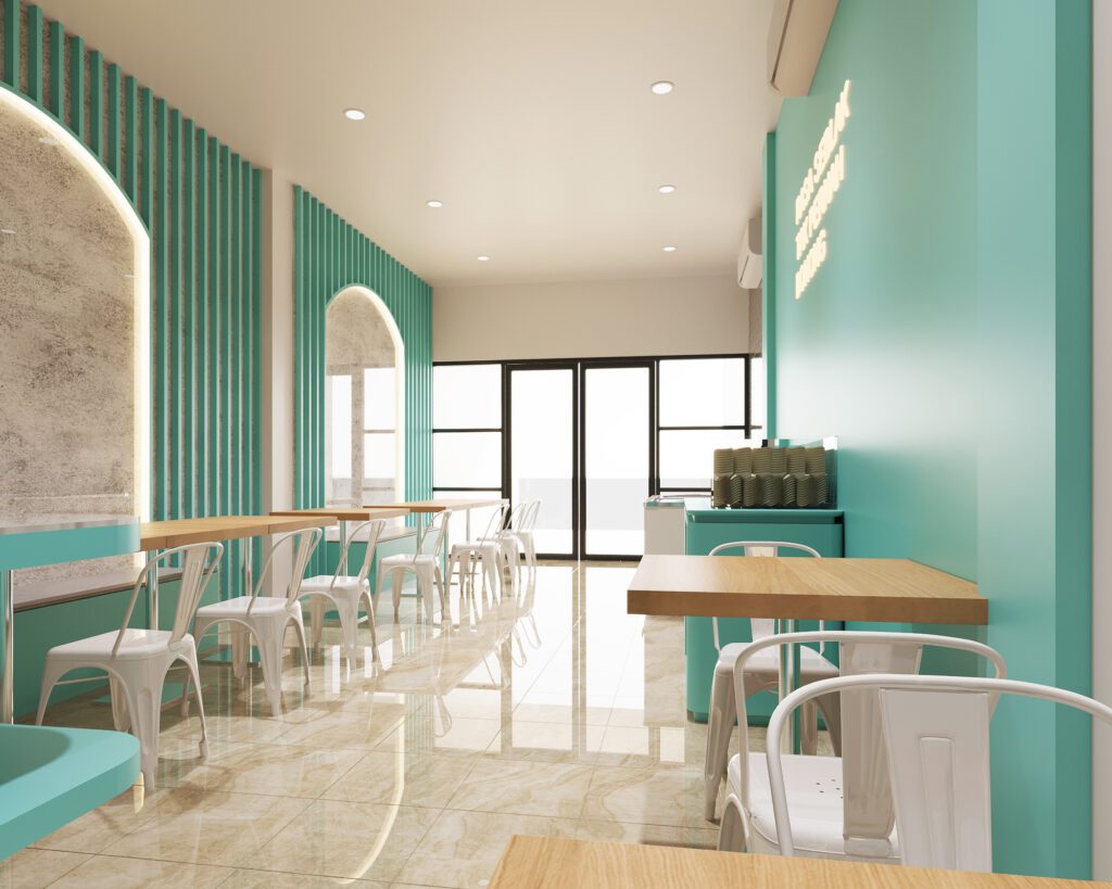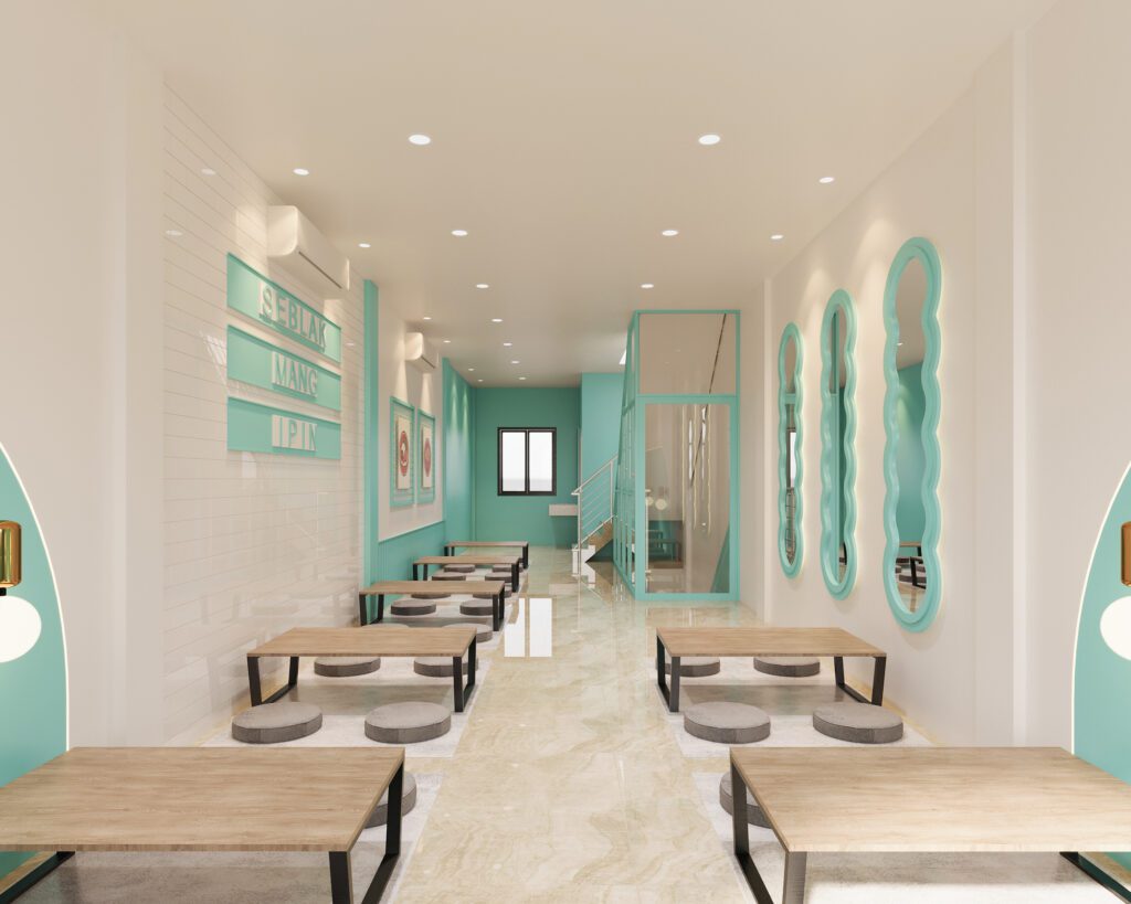 Extending the brand’s success, this outlet continues the playful mint-green and white palette while adapting to a new layout. Curved architectural details and communal wooden tables create a fun, social dining experience, complemented by floor-level seating with cushions. The design maximizes seating efficiency while ensuring the brand’s signature youthful atmosphere.